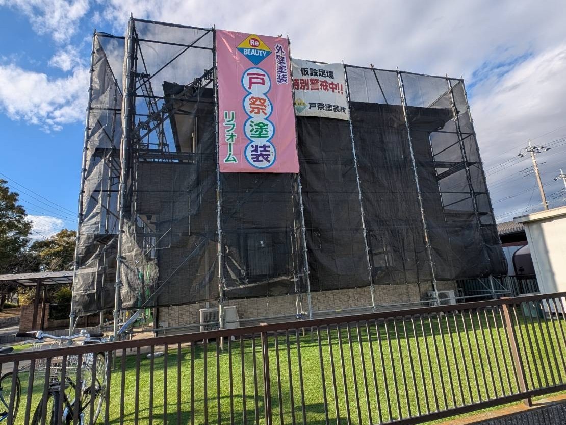 足場が組み上がると、最後に建物全体を**「飛散防止メッシュシート」**で覆います。