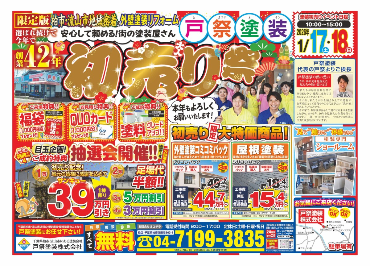 戸祭塗装 柏店では、日頃のご愛顧への感謝を込めて初売り祭を開催いたします😊🎉